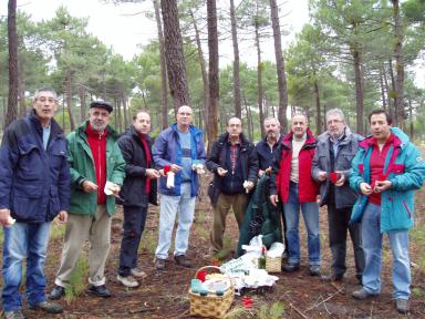 Tradicional almuerzo en el campo, amenizado con torreznos, jamón, cecina, chorizo y longaniza, queso......... , y regado con vinillo  para reponer fuerzas y seguir buscando.....